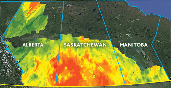 Some micronutrient deficiencies, such as zinc, are more common. Zinc deficiencies can cause yield loss in pulses, especially in the southern Prairies. The image above highlights zinc-deficient areas in red and orange. (Photo courtesy of A & L Canada Laboratories).